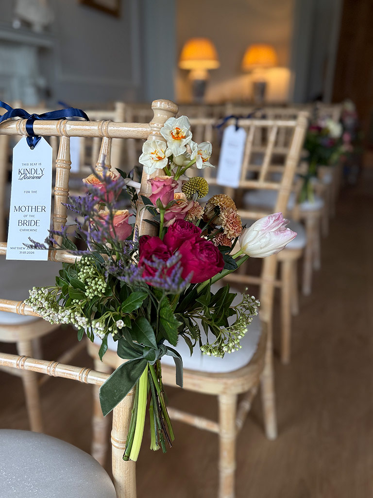 Flowers for the ceremony were designed to move with the day. Aisle posies were later repurposed into simple glass vases for the top table alongside the bridal bouquet. Bridesmaids’ bouquets were reworked for the guest tables, supported by small bud bottles to carry the colour palette throughout the space.